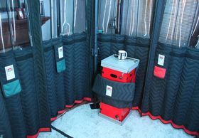 The Jonny Cage structural assembly is transformed from a 6x6 foot -10dB sound reduction drum booth chamber into two(2) road boxes for transporting.